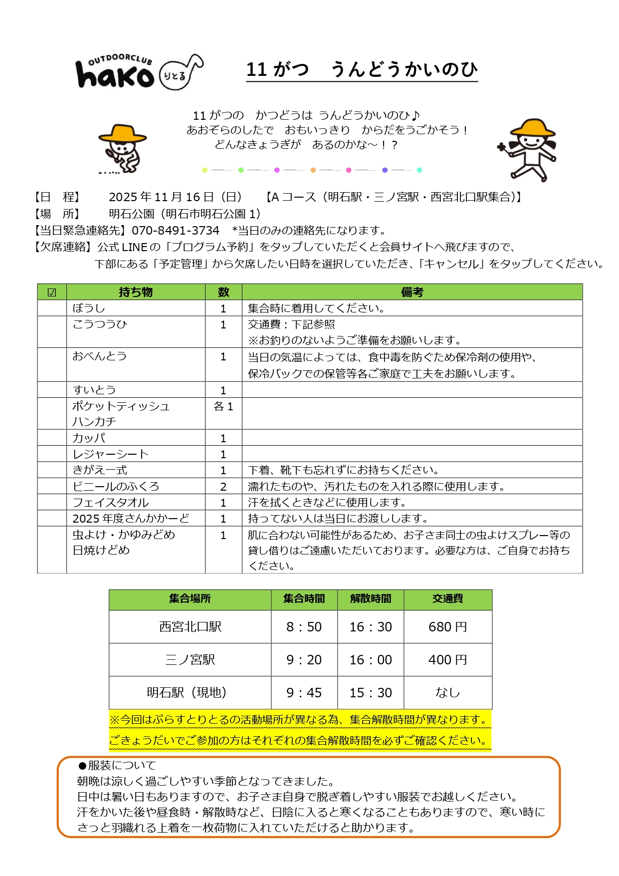 | 集合解散場所 | JR明石駅・JR三ノ宮駅・阪急西宮北口駅 | JR姫路駅・JR明石駅 | JR姫路駅・JR明石駅 | JR姫路駅・JR明石駅・JR三ノ宮駅・阪急西宮北口駅 |