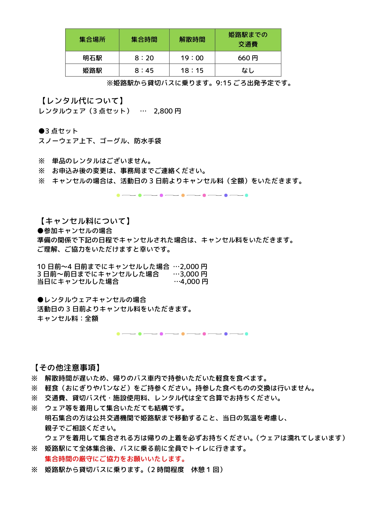 集合解散場所JR明石駅・JR三ノ宮駅・阪急西宮北口駅JR姫路駅・JR明石駅JR姫路駅・JR明石駅JR姫路駅・JR明石駅・JR三ノ宮駅・阪急西宮北口駅