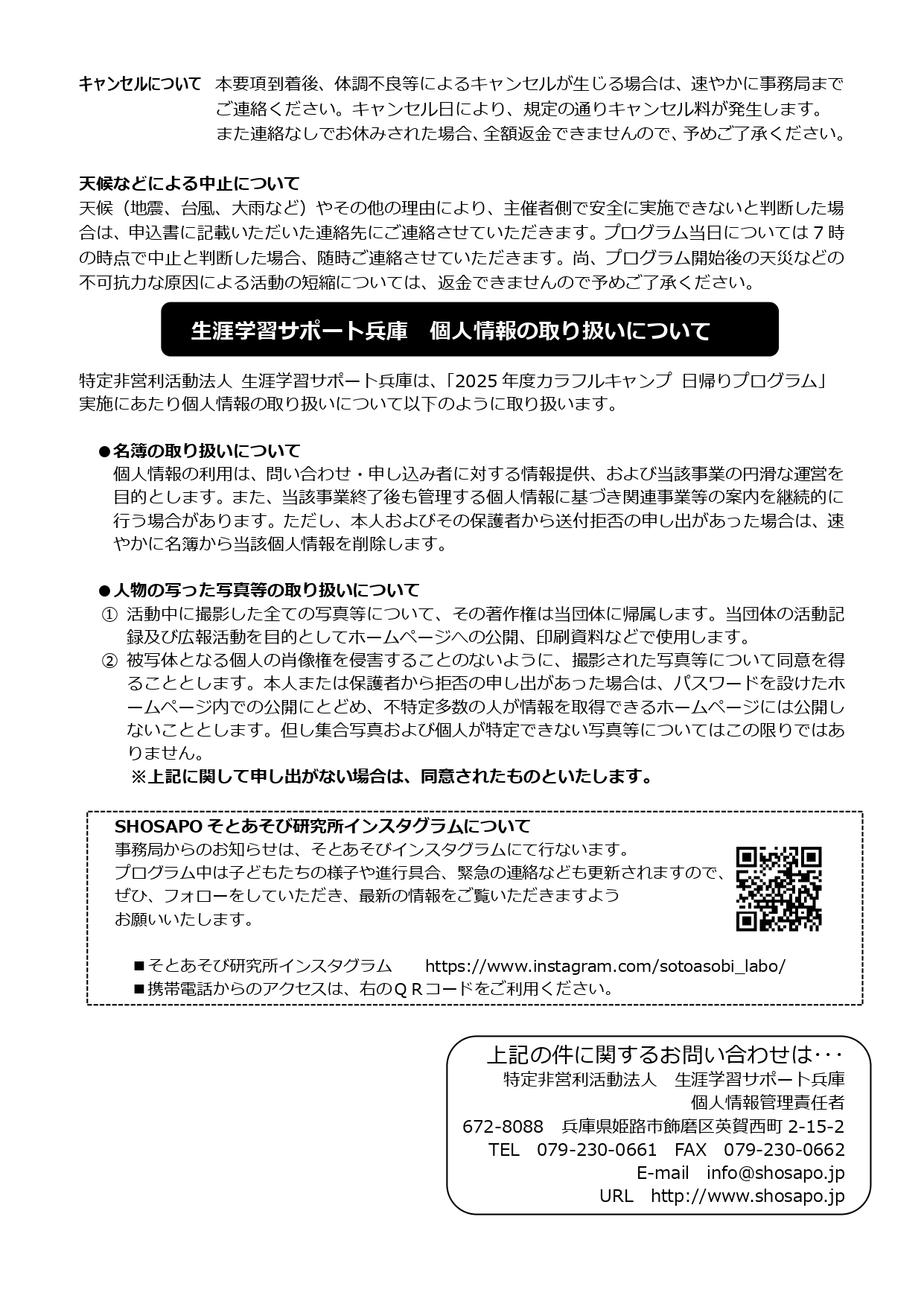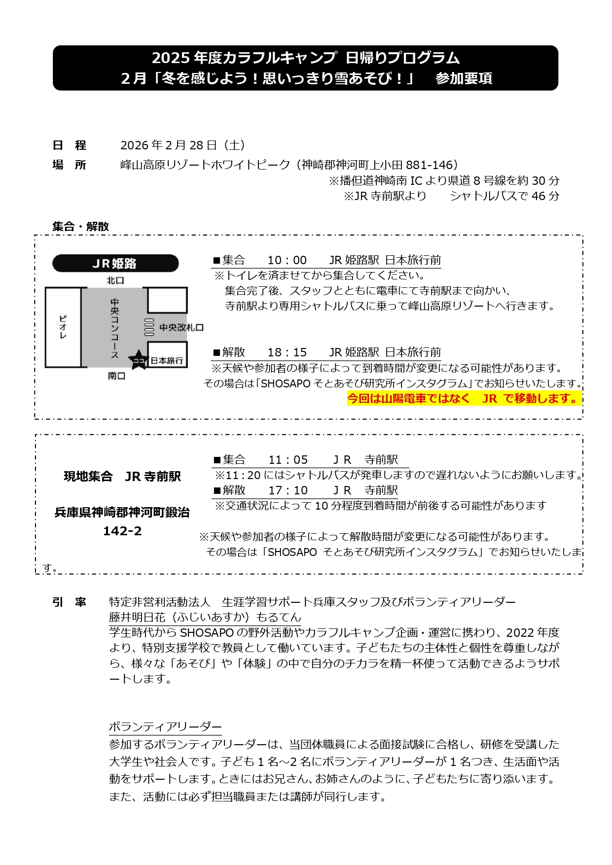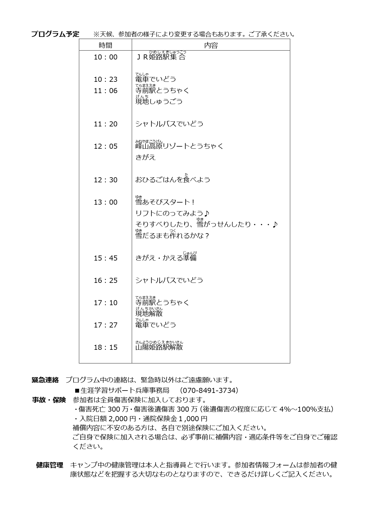 | 参加費 | 6,000円(税込) ※別途山陽姫路駅からの交通費 ※活動内容によって、別途施設使用料・活動費をいただくことがあります |
