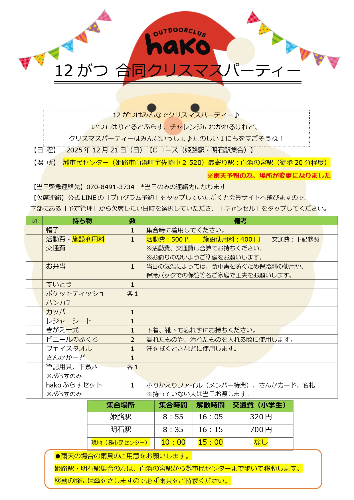 | 参加費 | 日帰り:6,000円(税込) ※別途山陽姫路駅からの交通費 ※活動内容によって、別途施設使用料・活動費をいただくことがあります ※おとまりキャンプの参加費は異なります。 宿泊:一般価格 18,000円(税込) ひとり親家庭・就学援助世帯応援価格 12,700円(税込) 別途施設使用料・活動費として2,500円を現地にて徴収させていただきます。 |