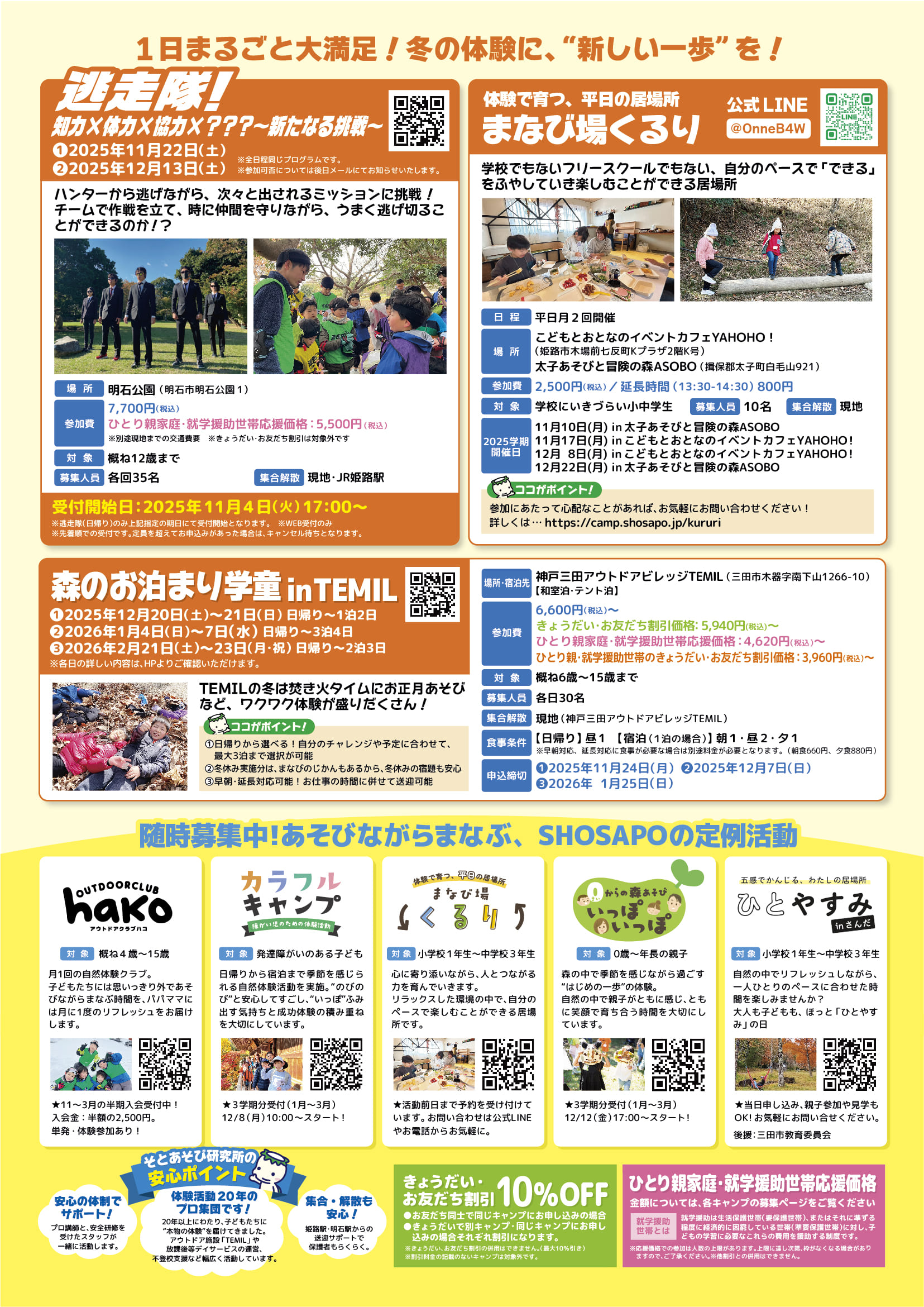 月1回の自然体験クラブ。子どもたちには思いっきり外であそびながらまなぶ時間を、パパママには月に1度のリフレッシュをお届け。
